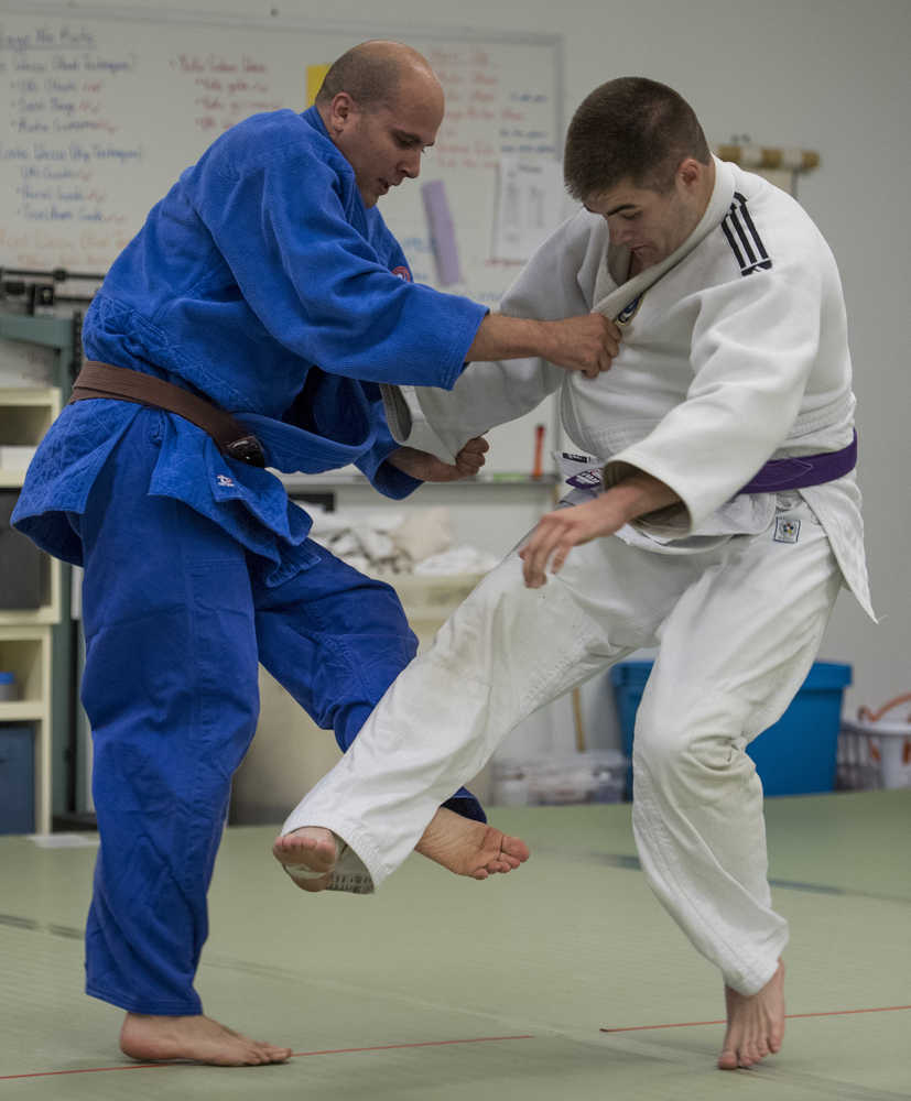 Cody Weldon, right, practices judo with instructor Luke Fortier at the Capital City Judo dojo on Tuesday.