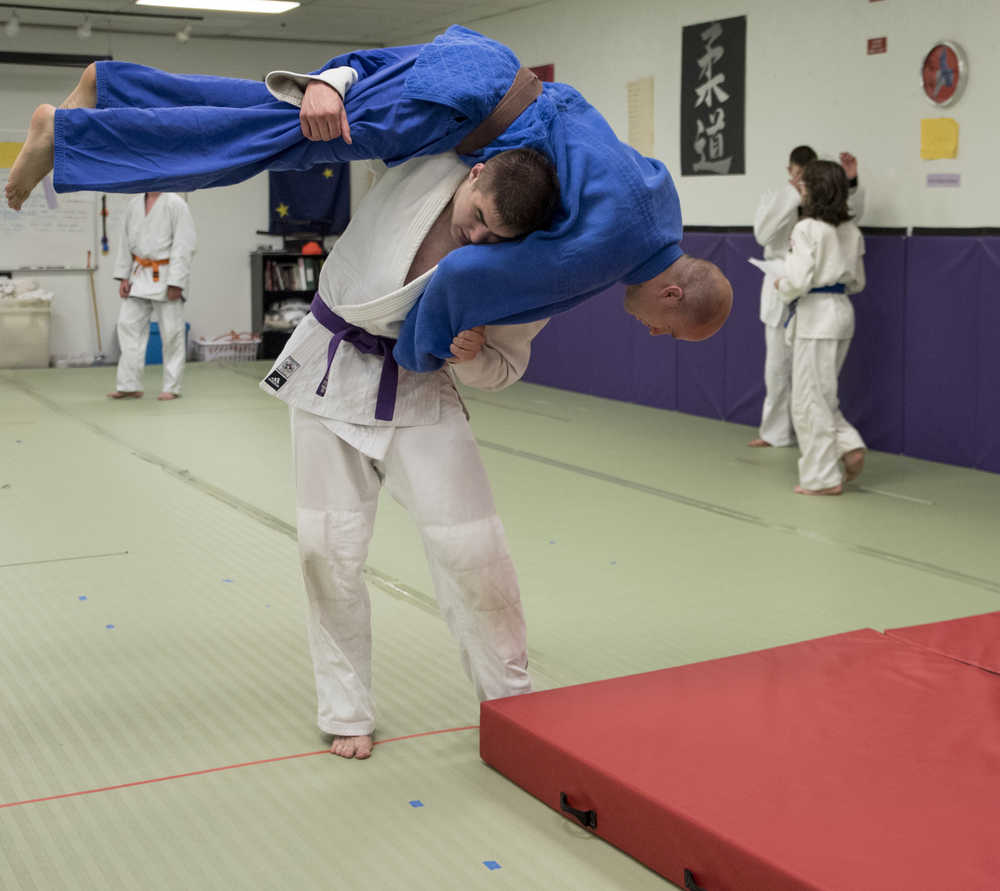 Cody Weldon throws instructor Luke Fortier during judo practice at the Capital City Judo dojo on Tuesday.