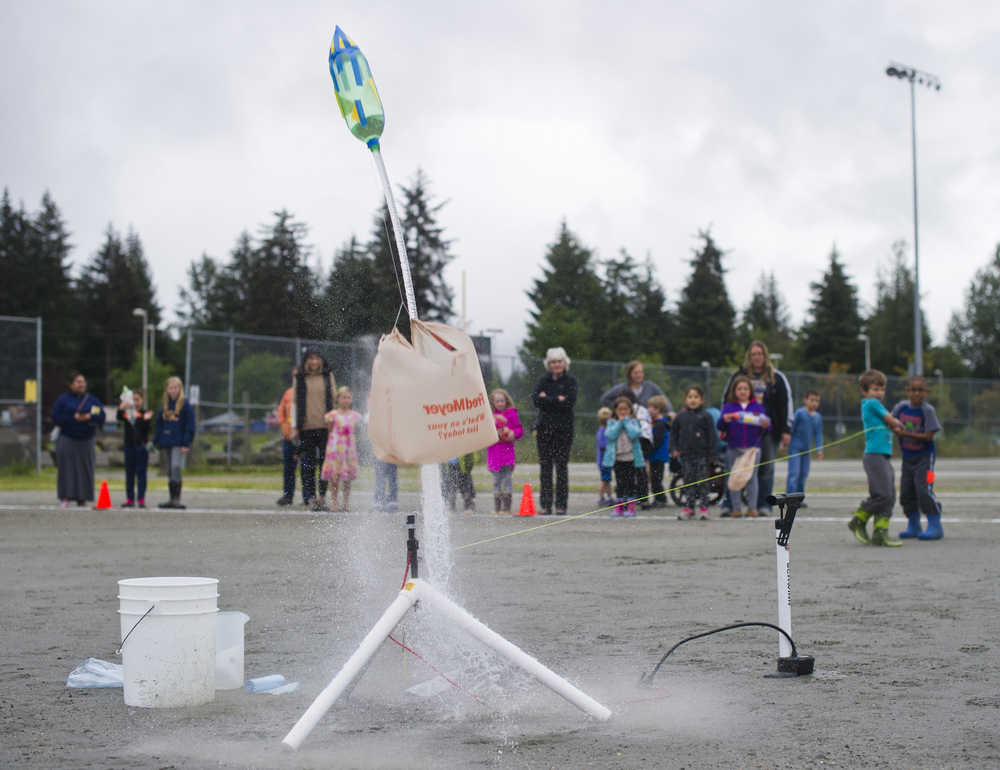Children and their parents watch a rocket return to the ground during Science Friday at the Mendenhall Valley Public Library on Friday. The event was made possible by the Juneau Public Library and the Seattle Museum of Flight.