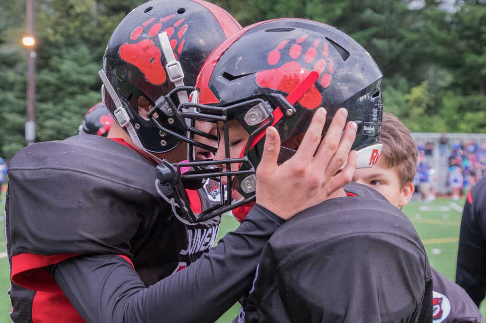 Crimson Bears players rally on the sideline during Saturday's game against Thunder Mountain. TMHS won 50-20.