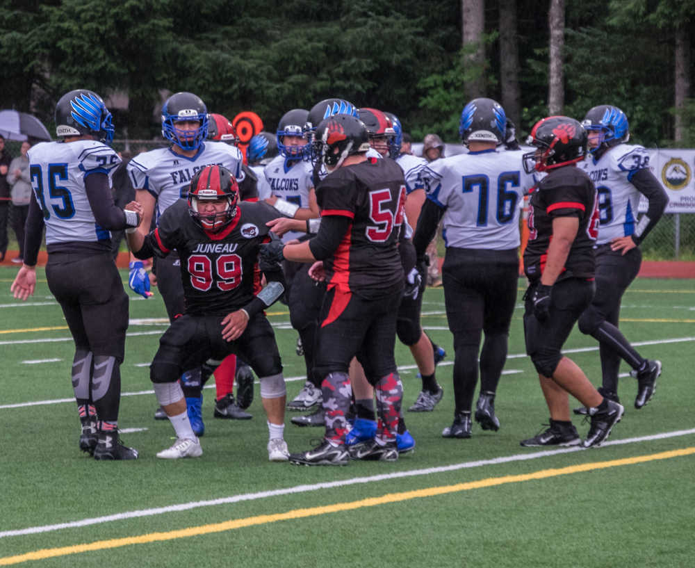 Thunder Mountain junior Jacob Tapia (20) and Juneau-Douglas junior Tyler Collins (29) battle downfield for position during Saturday's game at Adair Kennedy Field. TM won 50-20.