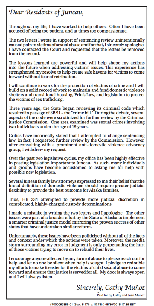 After the Empire article was published Aug. 21, she faced a barrage of criticism from her constituents — who lambasted her on her campaign Facebook page for supporting perpetrators instead of victims. One fellow legislator, Rep. Sam Kito III, said he was surprised to learn about her actions and initially felt they went against what he understood to be ethical Legislature-to-court policy. Statewide, editorials from the Alaska Dispatch News and the Empire circulated questioning Muñoz’s judgment.