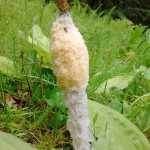 A slime mold aggregation has climbed up the seed stalk of a plantain.