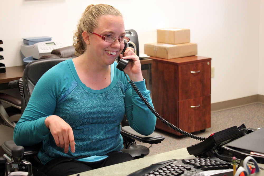 Sara Kveum, 28, has been receiving services from Hope Community Resources since she was a kid. Born with cerebral palsy, Kveum has a team of five to six help her with daily care and getting around in the community. Here, she's in her supported employment position at REACH, the agency that will soon take over her care when Hope closes.