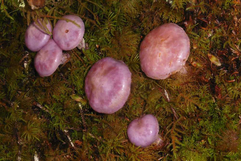 Purple woodland mushrooms nestle in a mossy bed on West Glacier Trail.