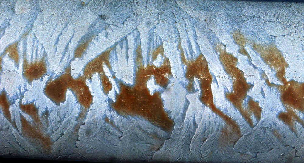 Rust on a guardrail resembles snow-covered mountainous terrain.