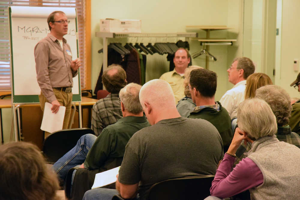 Chris Mertl, a landscape architect for Corvus Design, fields questions at a planning meeting for the Mendenhall Glacier Recreation Area on Wednesday.