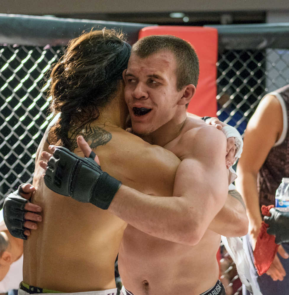 MMA fighters Nino Kafoa Maka (Left) and Zachary Oldaker (Right) showing good sportsmanship that ended in a unanimonus decison with the win going to Nino Kafoa Maka.