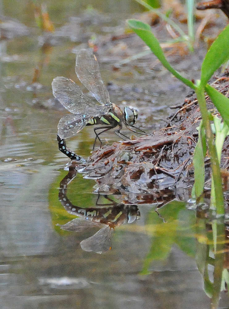 We chanced upon a big dragonfly, the kind known as a blue darner (we have several species here), inspecting one of the muskeg ponds and occasionally touching the mucky banks with the tip of her abdomen. She was ovipositing her eggs into the decaying vegetation and mud that line the pond banks. We watched for several minutes as she moved carefully around the edge of the pond, pausing several times to touch down and deposit an egg. If each of those eggs hatched, there could be 10 or 12 predatory, voracious larvae in this small pond, only about three feet by six feet. Could such a small pond support that many growing offspring — or even just one? The answer seems to be yes. A few days later in another small pond, I found three shed larval exoskeletons, left behind when adults emerged. But what are they eating? And how many ponds would the female visit before exhausting her supply of fertilized eggs?