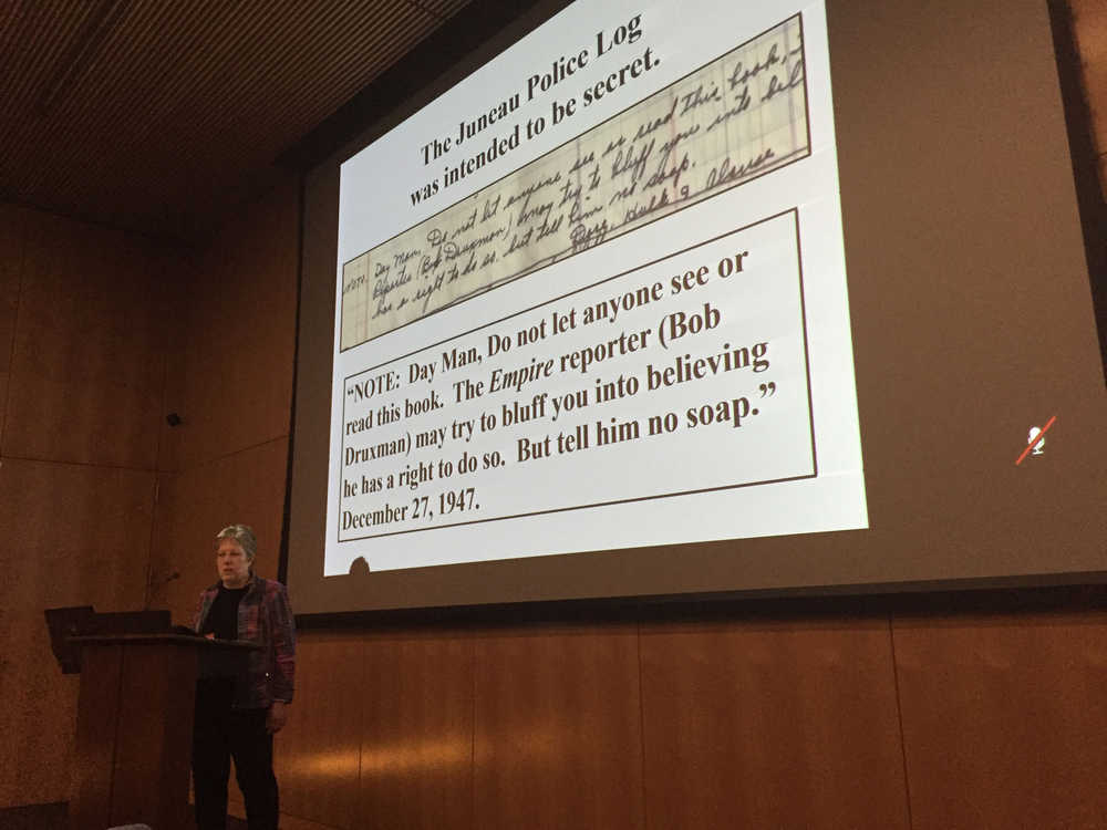 Prostitution is something historian and public defense lawyer Averil Lerman’s addressed in her talk on the “secret” police blotter kept by the Juneau police. Many of those blotters are now in public archives. Lerman spoke about the blotter from 1946 to 1947, which she said offers “a way for us to look at a mirror… of ourselves.”