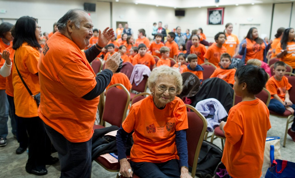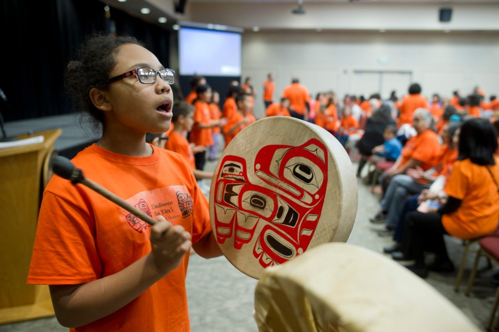 On Friday morning, elementary school-aged children wearing bright orange T-shirts danced and sang in Tlingit in front of their teachers, family and other community members with two girls beating on drums, their calls reaching to the far back of Elizabeth Peratrovich Hall.