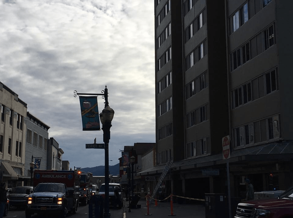 Juneau Police Department spokesman Lt. David Campbell said dispatchers received multiple calls about the incident at the Marine View Center apartment building on the corner of Ferry Way and Franklin Street at 1:09 p.m., but a name, age and medical status of the man who fell was not immediately available.