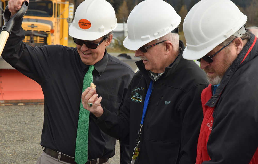 Bracketed by city manager Rorie Watt, left, and former Juneau Mayor Merrill Sanford, right, Juneau Airport Board chairman Joe Heueisen examines a ceremonial "gold" nugget given as a souvenir Thursday at the groundbreaking for the new Juneau International Airport Snow Removal Equipment Facility.