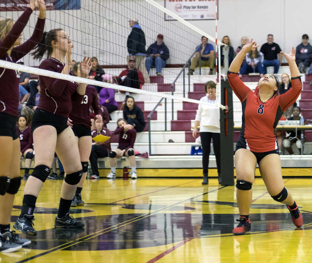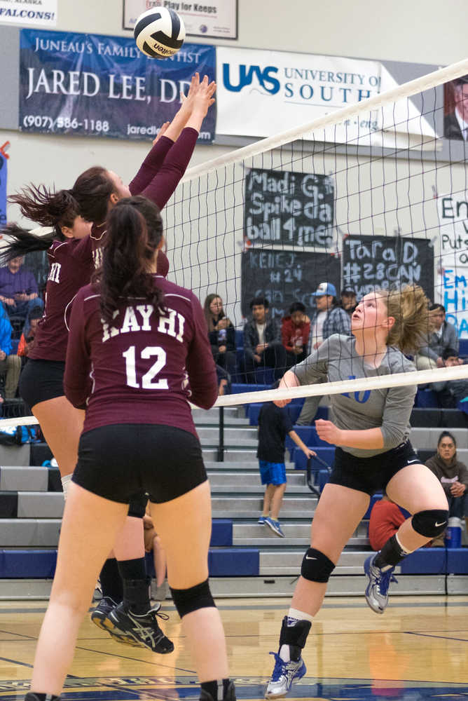 11, middle, making a solid effort to block the ball during Saturday night's varsity volleyball game against home team, the TMHS Falcons.