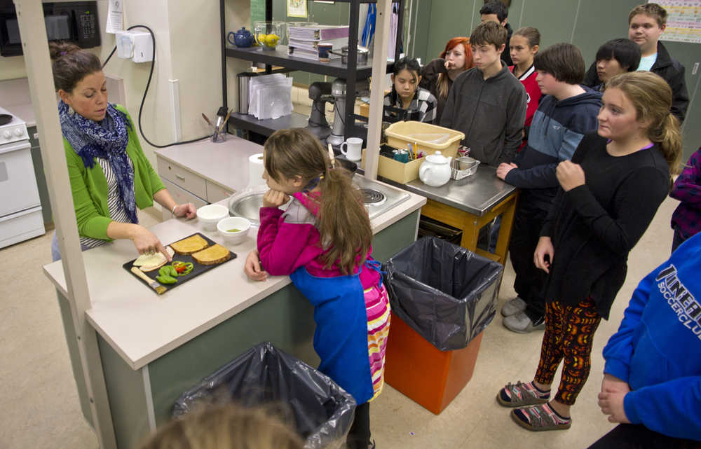 On a recent morning at Dzantik’i Heeni Middle School, students clustered around their Life Skills teacher Jessie Kovach as she demonstrated how to make panini. Kovach rotated the students through the six different George Foreman grill stations while others waited their turns by working on their sewing projects. As shown by their teacher, the students assembled their sandwiches, swiping olive oil on the bread, adding pesto, basil, tomato and Anaheim peppers along with the cheese and meat before grilling.