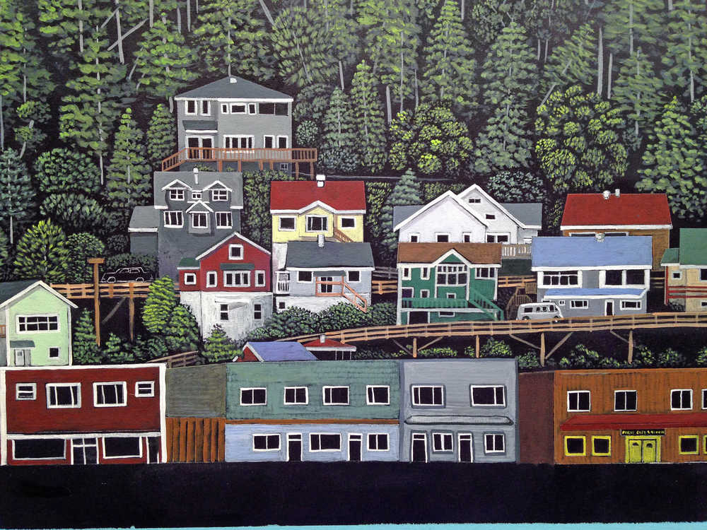 The mural is being done in the naïve style, a genre common to Latin American folk art. One of its main traits is a flattened perspective, “which is kind of perfect for the Ketchikan shoreline because we’re all kind of condensed here and stacked up on the side of the mountain,” Rickelmann said.