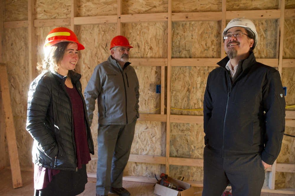 Mariya Lovishchuk, the executive director of the Glory Hole, John Gaguine, center, boardmember of the Juneau Community Foundation, and Joe Nelson, board chair for Sealaska, tour the Housing First Project on Jenkins Drive on Thursday, Nov. 17, 2016.