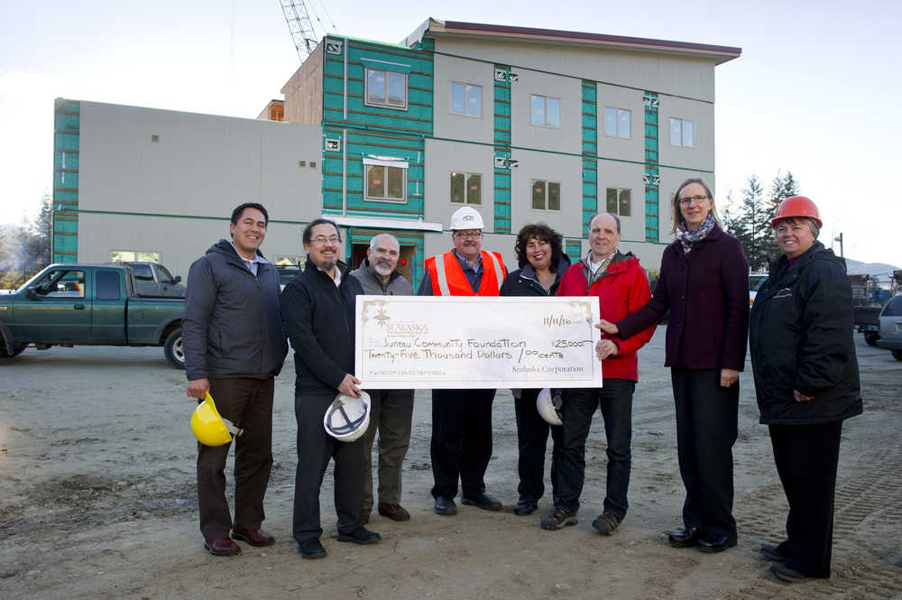 Sealaska presents a $25,000 check to the Juneau Community Foundation to be used on the Housing First Project on Jenkins Drive on Thursday, Nov. 17, 2016. From lef are: Anthony Mallott, president and CEO of Sealaska, Joe Nelson, board chair for Sealaska, John Gaguine, JCF boardmember, Craig Moore, of Tlingit and Haida Housing Authority, Myrna Gardner, of Tlingit and Haida Housing Authority, Bruce Denton, Juneau Housing First boardmember, Amy Skilbred, exective director of JCF, and Joyce Niven, of Tlingit and Haida Housing Authority