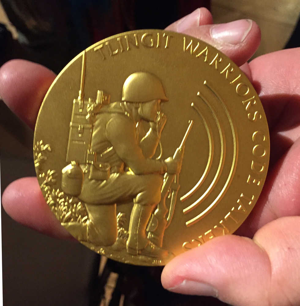 Central Council of Tlingit and Haida Indian Tribes of Alaska didn’t learn that Tlingits served as code talkers in WWII until 2008, Sheakley said. The Code Talkers Recognition Act passed that year, and so the U.S. Mint contacted CCTHITA to design the gold Congressional Medal of Honor for the Tlingit people and silver duplicates for the code talkers. Sheakley was the one who was asked to design them.
