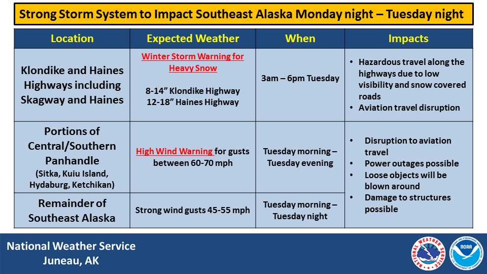 The National Weather Service has issued a high-wind warning for southern Southeast including Sitka and Ketchikan, and a winter storm warning for northern Southeast, including Haines and Skagway.