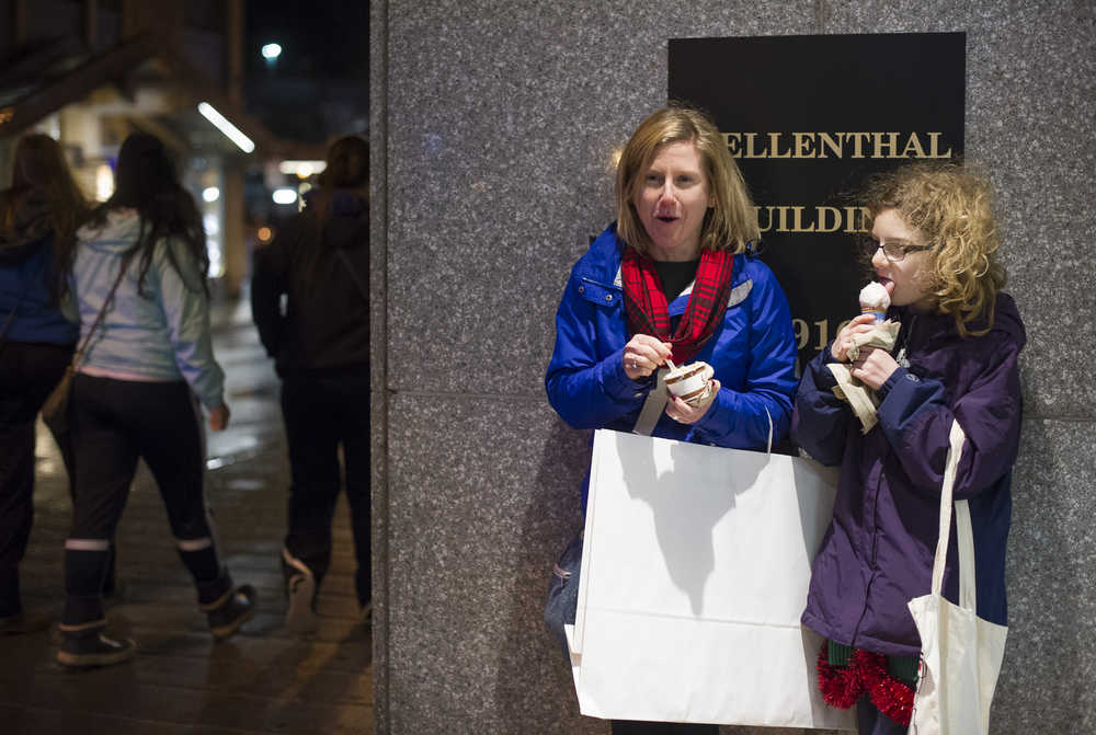 Christy Newell and her daughter, Ava, hunkers out of the wind and rain to enjoy their Coppa ice cream on Front Street during Gallery Walk on Friday, Dec. 2, 2016.