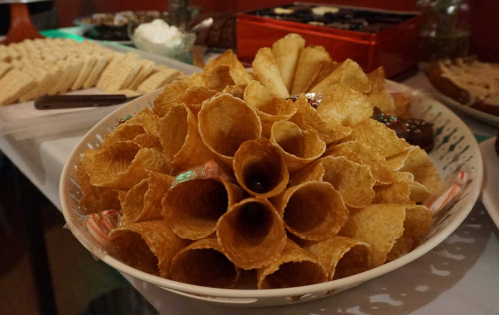 We pronounce it “YOO-le-bukk-ing,” and stuff ourselves with food while catching up with everyone else. A typical julebukking spread includes a buffet of baked goods, seafood, veggie trays and beverages. Smoked salmon and Norwegian baked goods such as lefse (lef-sa) and krumkake (krUm-ka-ka) are a traditional favorite.