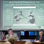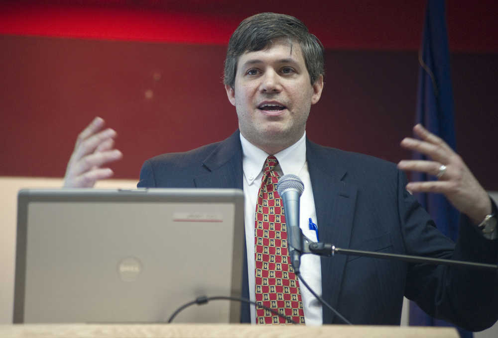In this Feb. 4, 2016 photo, Senate State Affairs Committee members listen to UAA Professor Emeritus in Economics Scott Goldsmith about possible budget solutions during a hearing at the Capitol. Several lawmakers intend to introduce legislation in 2017 that would secure Permanent Fund dividend payments to Alaskans.