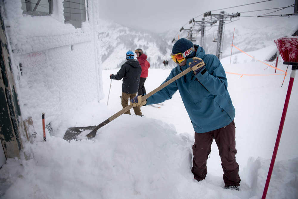 Kori Lane shovels snow at the top of the Black Bear Chairlift at Eaglecrest Ski Area on Monday. Eaglecrest had 4 inches of new snow at the top of the mountain on Monday. Skiers ride the Black Bear Chairlift at Eaglecrest Ski Area on Monday. Eaglecrest had 4 inches of new snow at the top of the mountain on Monday. Eaglecrest is open daily for the holidays through Monday, Jan. 9.