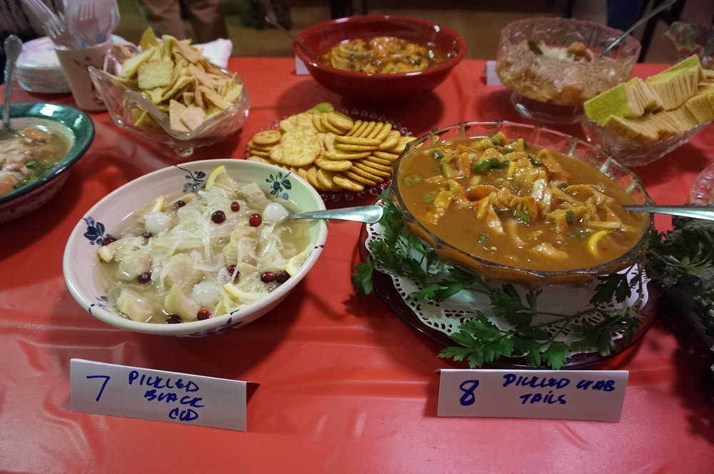 This year, organizers found a solution. The public was put to “work” judging appetizers provided by community members. The appetizers were laid out on a long row of tables down the center of the half of the hall not filled with pickled or smoked items. Creative uses of seafood and veggies were rewarded with star stickers, and the growing crowd of people was kept occupied while the official competition was underway.