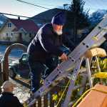 Jim Nelson climbs a ladder held by his neighbor Jim Fowler on Monday, Jan. 9, 2017, as he replaces asphalt shingles blown off his roof by last week's wind storm.