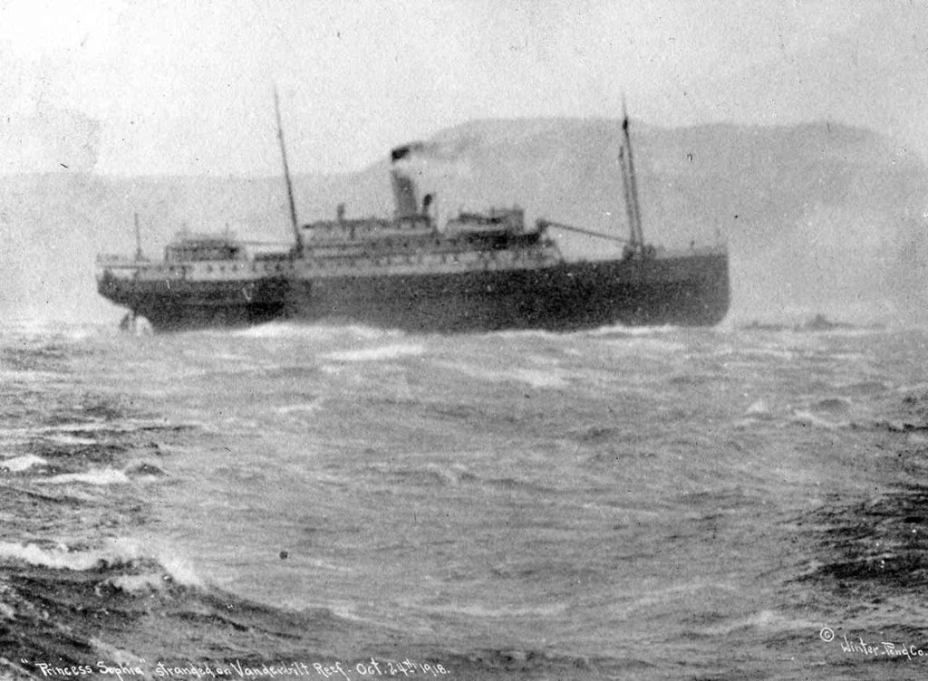 “In October 23, 1918, the Canadian Pacific Steamship SS Princess Sophia sailed from Skagway with a full load of more than 350 passengers and crew. Many of them were heading south for the winter, having worked in the interior of the Yukon and Alaska territories all summer. The festive mood was soon disrupted in the middle of the night when the ship struck Vanderbilt Reef in a storm on Lynn Canal, about 20 miles north of Juneau. The ship was stuck on the reef, apparently unharmed, and Captain Louis Locke decided to wait for high tide, hoping the ship would float free. In the meantime, a cadre of small boats from Juneau waited for the lowering of life boats to take passengers away to safety. Over the next day and a half, that moment never came, and the storm worsened.