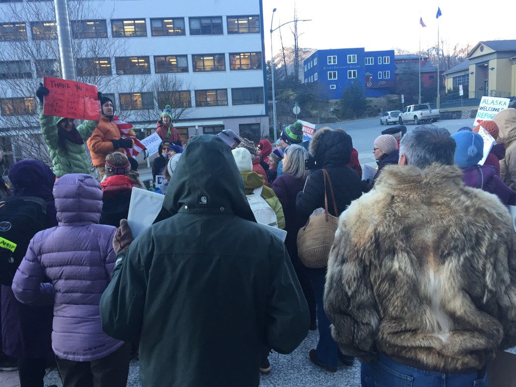 People gathered prior to work (from 7-8:30 a.m.) Monday in front of the Alaska State Capitol to support refugees and immigrants. (Mary Catharine Martin | Juneau Empire)