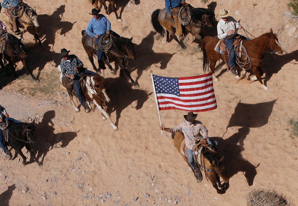 In this April 12, 2014 photo, the Bundy family and their supporters fly the American flag as their cattle is released by the Bureau of Land Management back onto public land outside of Bunkerville, Nev. A federal judge in Nevada is considering crucial rulings about what jurors will hear in the trial of six defendants accused of stopping U.S. agents at gunpoint from rounding up cattle near Cliven Bundy’s ranch in April 2014. (Jason Bean | Las Vegas Review-Journal)