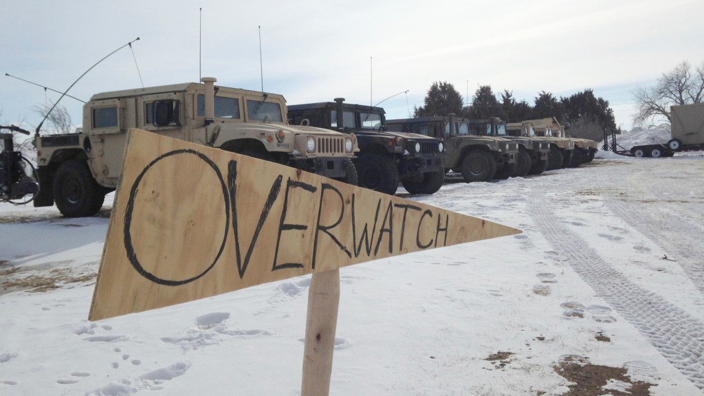 Officers and National Guard soldiers were stationed on the hills near the camp and at a blockaded bridge on a nearby highway. Energy Transfer Partners has its own security at the drilling area.