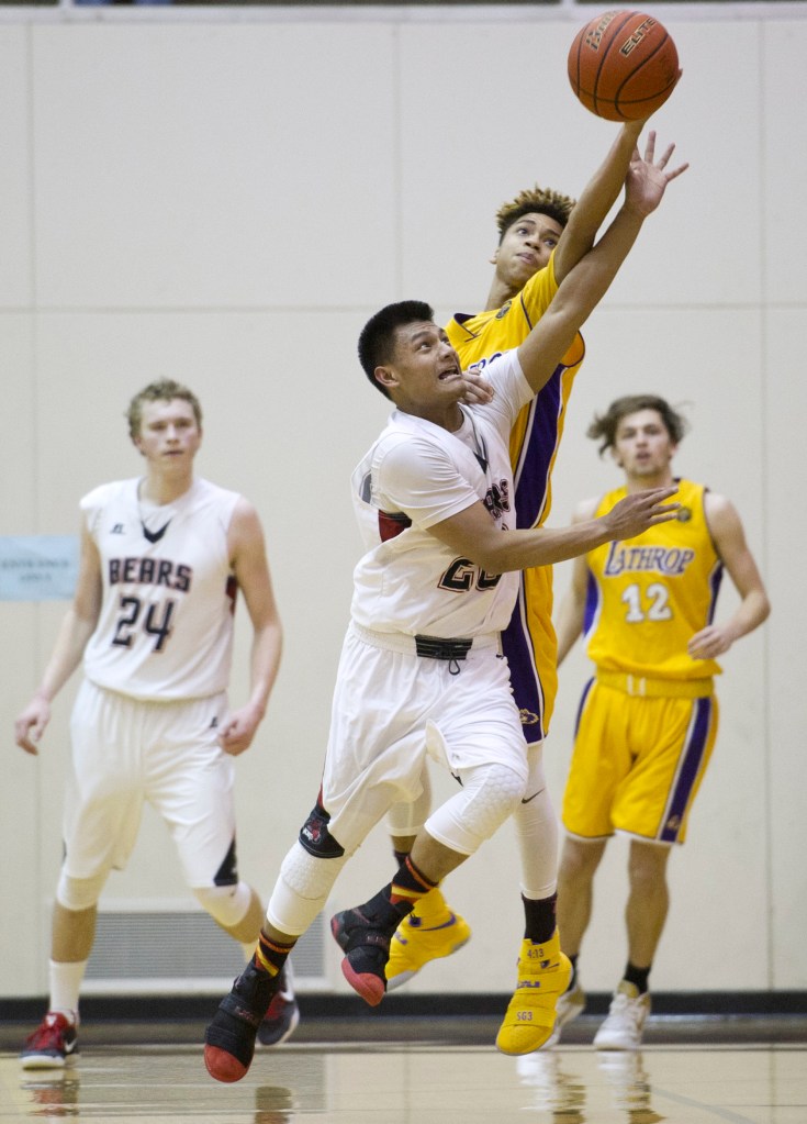 Juneau-Douglas’ Ulyx Bohulano gets a shot up against Lathrop’s Jake Carlson at JDHS on Friday, Feb. 10, 2017. JDHS won 50-43. (Michael Penn | Juneau Empire)