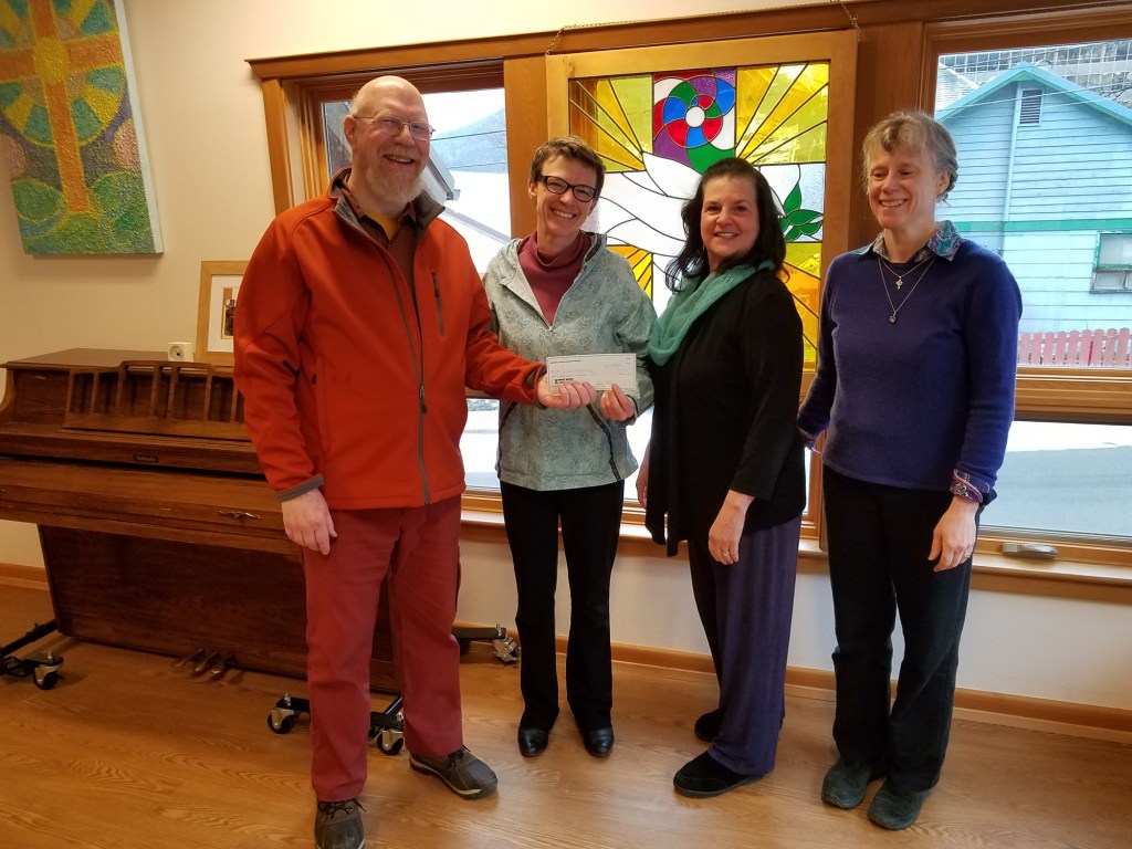 Family Promise of Juneau Executive Director Joann Flora and Board Chairperson Tari Stage-Harvey receive a check for $3,500 from the Episcopal Deanery of Southeast Alaska Dean Robert Coghill and Ann Gifford, Senior Warden of Holy Trinity Church to assist with the organization’s start up costs.
