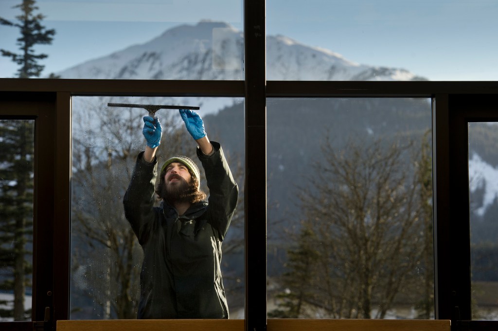 Dan Turner, an employee at Centennial Hall, takes advantage of the clear weather to wash the convention center’s windows on Thursday. (Michael Penn | Juneau Empire)