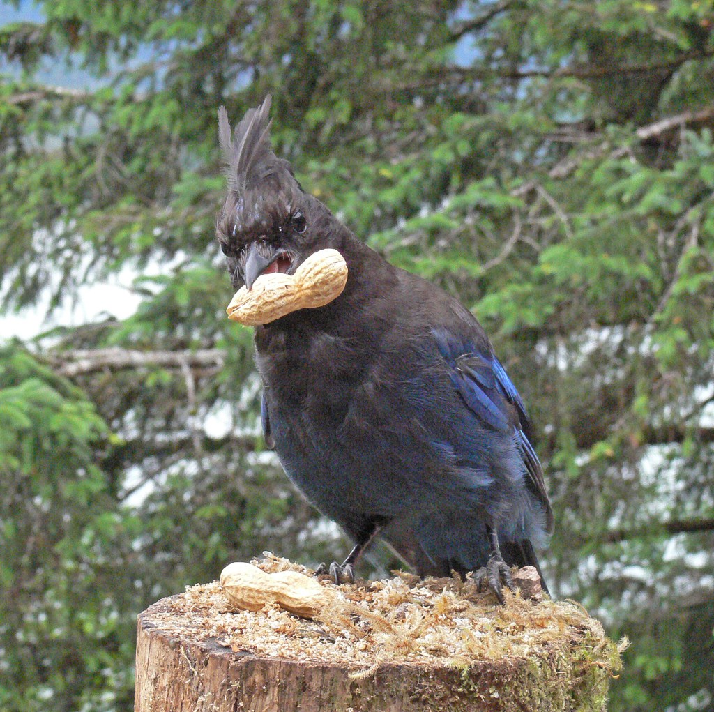 I don’t know how often our jays consume the seeds of our trees (spruce, hemlock, pine, cottonwood, alder, willow); all of these seeds are small and typically dispersed by wind; they probably don’t offer much nutrition to a relatively large bird such as a jay. However, in more southerly portions of their geographic range, Steller’s jays are known to harvest and cache the seeds of several conifers. Not all of these caches are retrieved and the seeds germinate, so there the Steller’s jays are contributing (along with other kinds of jays and Clark’s nutcracker) to seed dispersal, a critical portion of a plant’s life cycle.