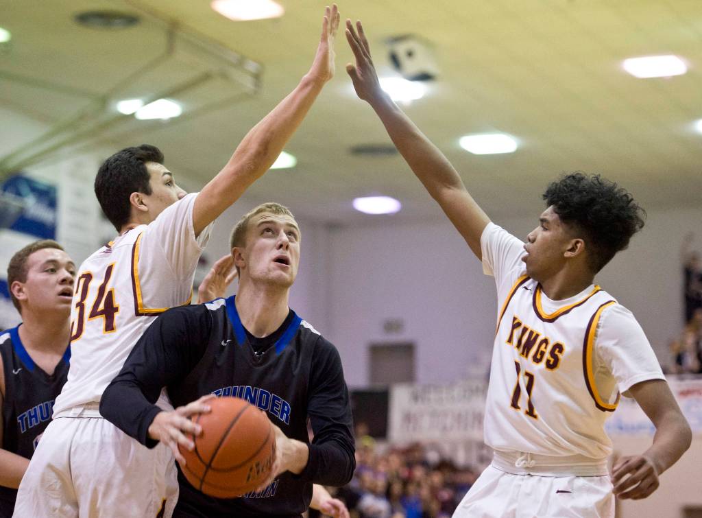 Thunder Mountain’s Riley Olsen, center, looks for the basket against Ketchikan’s Robert Seludo, left, and Chris Lee during the 4A Regional V Basketball Tournament at JDHS on Wednesday. Ketchikan won 65-44. (Michael Penn | Juneau Empire)