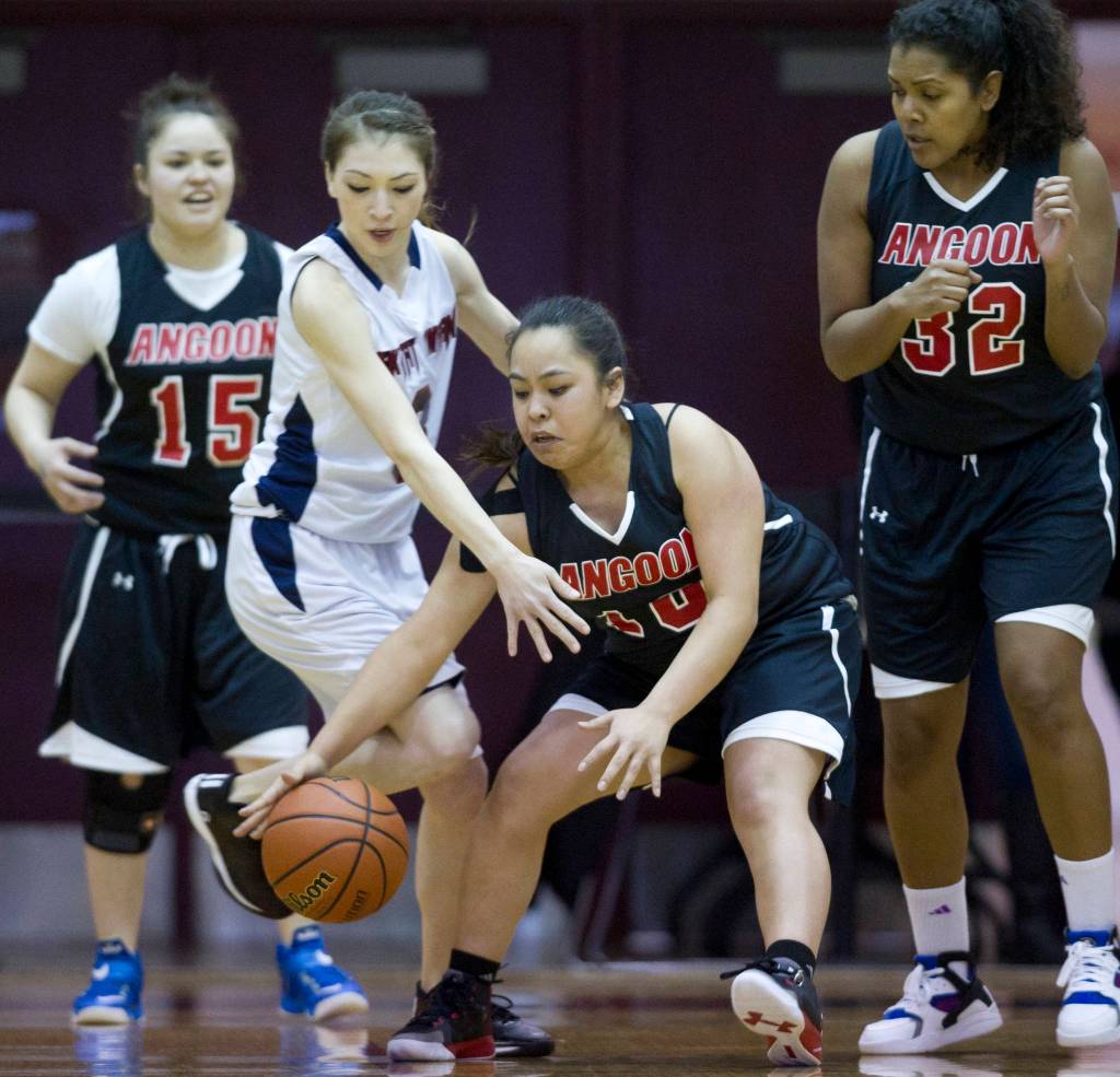 Yakutat’s Katrina Fraker, left, challenges Angoon’s Rosanna See for the ball during the Women’s Bracket game in the Lions Club’s Gold Medal Basketball Tournament at Juneau-Douglas High School on Tuesday. Yakutat won 61-41. (Michael Penn | Juneau Empire)
