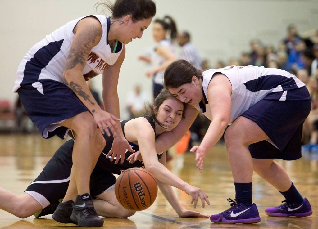 Yakutat’s Lorena Williams, right, wrestles with Angoon’s Roxann Braley, left, and Rosanna See for the ball during the Women’s Bracket game in the Lions Club’s Gold Medal Basketball Tournament at Juneau-Douglas High School on Tuesday. Yakutat won 61-41. (Michael Penn | Juneau Empire)