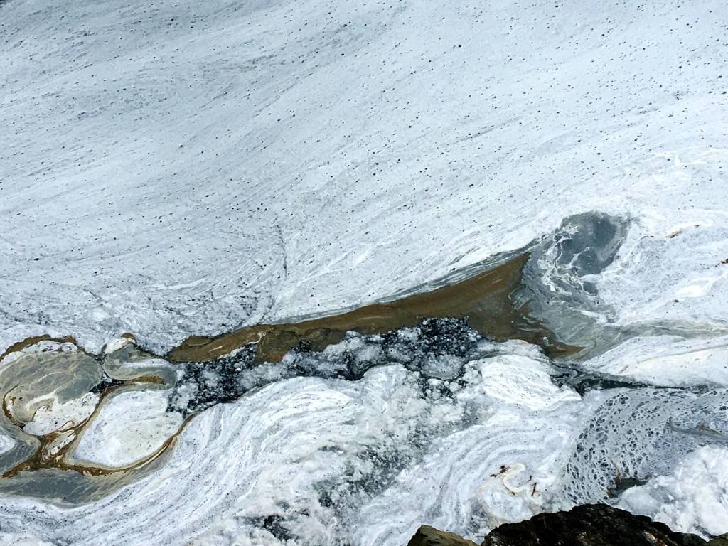 Thick creamy swirls of fish slime on the incoming tide in the downtown boat harbor. Photo by Denise Carroll.