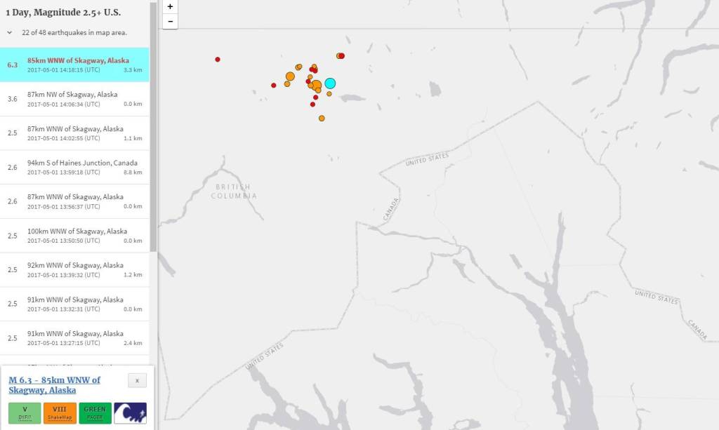 According to the U.S. Geological Survey’s preliminary estimates, the first temblor was a magnitude 6.2 quake that occurred at 4:31 a.m. and was centered along the Haines Highway in British Columbia, between Haines Junction in the Yukon and Haines in Alaska.