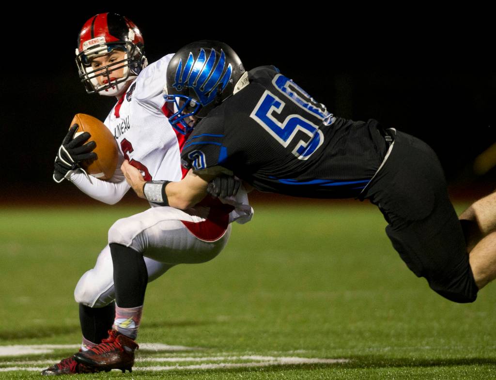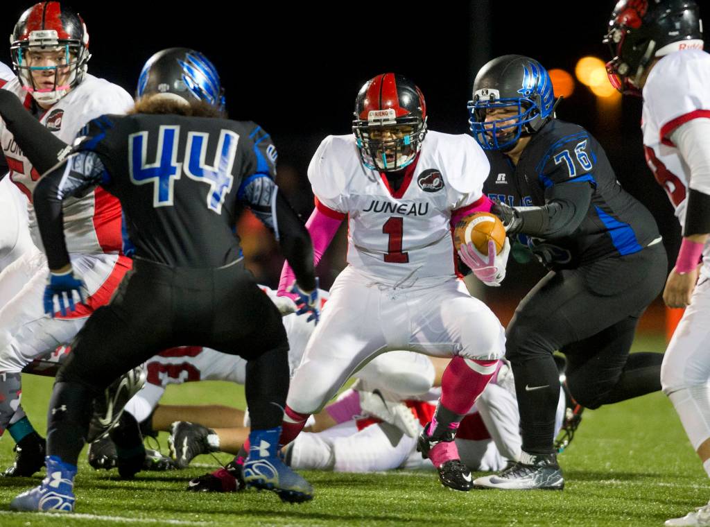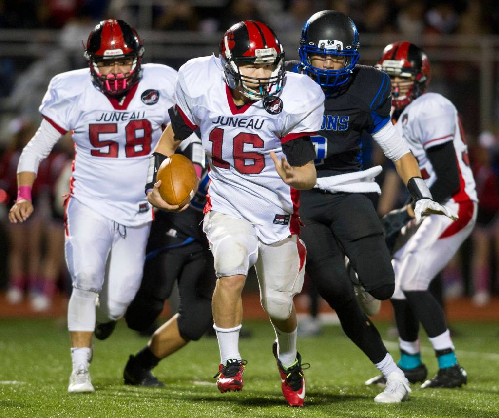 Juneau-Douglas’s quarterback Maximus Wheat is chased by Thunder Mountain’s Dominique Maua in a cross town conference game at TMHS on Sept. 30, 2016. (Michael Penn | Juneau Empire File)