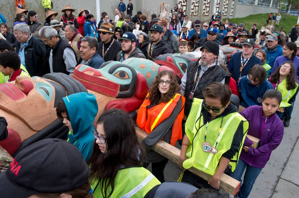 In one way, Saturday’s totem pole raising ceremony at Gastineau Elementary School felt like the culmination of a decades-long process. At the same time, those on hand were excited for it to mark the beginning of a new era as well.
