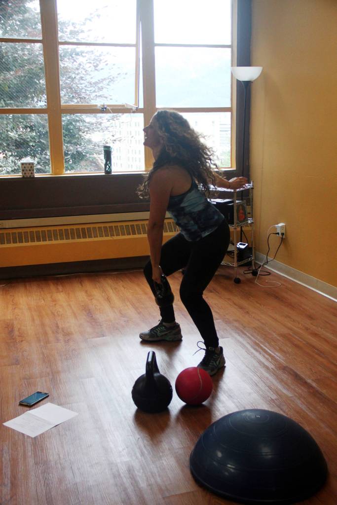 This workout involved things like kettlebell lunges, working your arm muscles as you swing weight from side to side while also engaging your leg muscles as you lunge. The intense cardio came in the form of holding a medicine ball over your head while jogging in place, on top of a bosu ball. Sounds complicated, right? A bosu ball is a half exercise ball type contraption that is meant to support your back through core exercises while also providing a softer surface for jogging in place, engaging your balancing muscles while also spiking your heart rate through cardio.