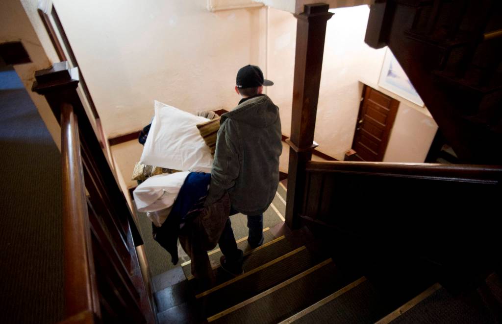 A Bergmann Hotel tenant removes his bedding after the city closed the hotel for health and safety reasons on Friday, March 10, 2017. (Michael Penn | Juneau Empire)
