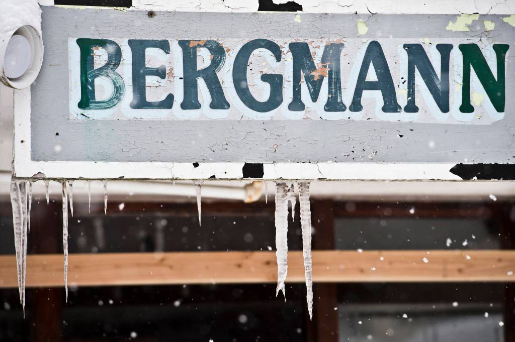 Chipped paint and icycles hang from the Bergmann Hotel sign on Monday, March 13, 2017. (Michael Penn | Juneau Empire)