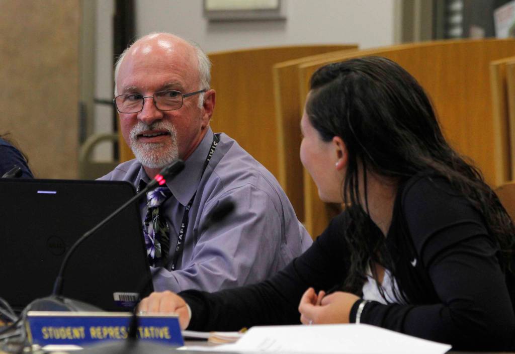Juneau School District Superintendent Mark Miller smiles at Student Representative Dessa Gerger, a junior at Juneau-Douglas High School, at Tuesday’s Board of Education meeting. Topics at Tuesday’s meeting included teacher shortages and a new policy manual for the district. ALEX McCARTHY | JUNEAU EMPIRE