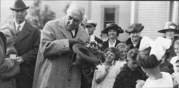 With the end of the speech, the President and Mrs. Harding were presented with a carved ivory vase, an ivory pin, a beaded moose hide table cover, and several bouquets of flowers. The party then visited the Pullen House museum.